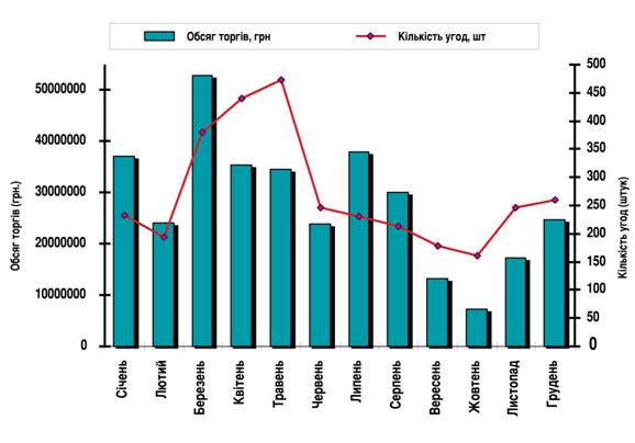 Как видно из рис. 1.1, самый большой объем торговли наблюдался в марте (52,8 млн. грн.), самый малый - в октябре (7,4 млн. грн.). Среднемесячный объем торговли составил 28,2 млн. грн., или 1,34 млн. грн. за торговую сессию. В продолжение года уменьшались квартальные показатели объем торговли (см. табл. 4.1), но уже в конце года наблюдалась тенденция к их увеличению (см. рис. 4.1 ). Как видно из таблицы 2.2.1, аналогичные тенденции также наблюдались в количества соглашений и капитализации 20 самых больших эмитентов.