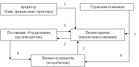 1-кредит; 2-оплата оборудования; 3-продажа оборудования; 4-лизинговый договор; 5-лизинговые платежи; 6-поставка оборудования; 7-страхование оборудования. 1
