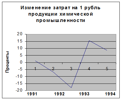Из представленных данных видно, что в течение 1991-1992 г.г. затраты на 1 рубль продукции химической отрасли страны снижались, затем резко возросли в 1993 г., и далее – постепенно снижаются. Вероятно это связано с общим состоянием экономики: спадом производства в смежных отраслях и увеличением стоимости сырья.