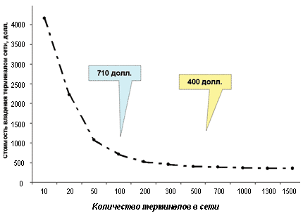 Стоимость владения терминалом корпоративной спутниковой сети, состоящей из 100 станций, составляет $710 ежемесячно. Для сети, включающей в себя 500 станций, ежемесячная стоимость владения падает до $400. Эта сумма включает в себя поэтапную компенсацию следующих расходов заказчика: покупку оборудования центральной станции и удаленных терминалов; доставку оборудования к месту установки; установку оборудования, подключение внешнего оборудования заказчика; получение лицензий на эксплуатацию радиоэлектронных средств; аренду спутникового сегмента; сервисное обслуживание станций сети.