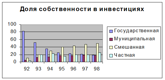 В целом же можно уже говорить с некоторой долей уверенности о первых после кризиса положительных сдвигах в инвестиционном климате России, о котором говорят приведённые ниже цифры. За полгода показатель рублёвых инвестиций вырос в 3 раза и достиг к апрелю 1999 года отметки в 2 млн. руб. в том числе 1.2 млн. руб. прямых инвестиций, что говорит об активизации национальных инвесторов, а также говорит о некотором доверии к правительству России в целом, и к относительной устойчивости российской экономики. Акции российских предприятий за последние полгода подорожали в среднем почти в 2.5 раза. Это даёт надежду на то, что инвестиционный климат России всё же делает какие-то движения вперёд, хотя и не очень уверенными шагами. В целом общая ситуация в российском производстве может резко измениться в ближайшие 5-10 лет в лучшую сторону, если существующие тенденции капиталовложений будут сохраняться в будущем. В перспективе мы уже можем надеяться на улучшение ситуации в российской экономике в целом по России, ведь вместе с увеличением инвестиций в нашу экономику, увеличится её стабильность, уменьшится риск долгосрочных кредитов, а значит, будут претворяться в жизнь многие проекты, рассчитанные на улучшение социальной сферы (бюджет в данный момент не справляется даже с необходимым минимумом программ), что в свою очередь уменьшит