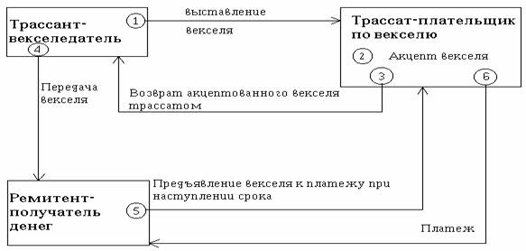 Очевидно, что в переводном векселе изначально участвуют не два, как в простом, а три лица: 1) векселедатель (трассант) – лицо, выдавшее вексель; 2) векселедержатель (ремитент), имеющий право на получение платежа у трассата; 3) трассат, являющийся плательщиком по векселю.