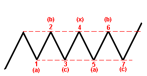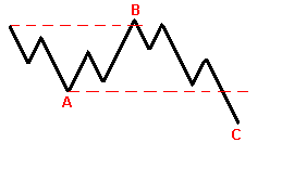Вершина волны (В) превышает верх волны (А), а волна (С) опускается ниже основания волны (А) для бычьего рынка, и, наоборот, для медвежьего.
