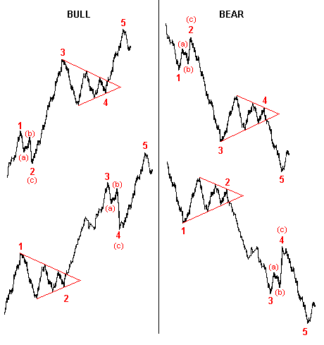 Вершина треугольника (то есть точка, в которой сходятся все линии тренда) часто соответствует моменту завершения (5) заключительной волны.