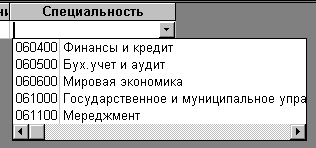 Поле Специальность Для данного поля в качестве информации используется значения из списка. В качестве списка приводится фиксированный набор значений (2 столбца) 1 столбец – номер специальности, 2 – ее наименование.
