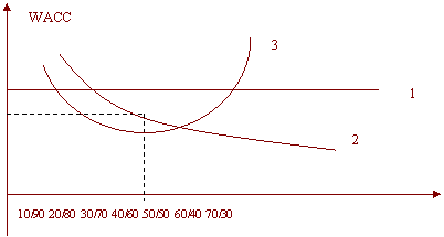 По современным представлениям, в реальных условиях при повышении доли ЗК более, чем на 50%, кредиторы начинают волноваться и новые кредиты дают под более высокие ставки. Инвесторы тоже следят за структурой капитала: кривая плавно начинает расти (3).