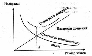 Точка Х показывает оптимальный размер заказа, который минимизирует общие издержки, связанные с запасами. Справа от этой точки снижение затрат на выполнение заказа оказывается меньше, чем дополнительные расходы по содержанию запасов. На практике нельзя достоверно определить точный спрос на товарно-материальные ценности. Особенно это проявляется в условиях нестабильных рынков. Даже при отлаженных горизонтальных связях с поставщиками сырья и комплектующих нет стопроцентной гарантии в соблюдении договорных графиков поставок. Более того, возможна ситуация стойкого дефицита на материальные ресурсы, что ставит под угрозу бесперебойность производственного процесса а следовательно, сводит на нет все предварительные расчеты себестоимости продукции и отпускных цен, поскольку срывается запланированный объем выпуска.