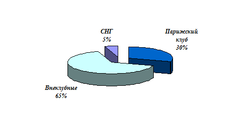 Большая часть межгосударственных кредитов в этой подгруппе была формой финансовой поддержки дружественных СССР политических режимов в странах третьего мира, т.е. предоставлялась без сколько-нибудь серьезного анализа платежеспособности заемщиков. Как следствие, обязательства большинства государств относятся теперь к разряду сомнительной и даже безнадежной задолженности. Из суммарного долга 51-ой страны России в 120 млрд. долл. почти треть приходится на 25 стран, обратившихся в этот клуб с просьбой о реструктуризации задолженности. В рамках клуба у России 5 крупнейших должников: Алжир, Вьетнам, Йемен, Мозамбик и Эфиопия. Например, на нашу страну приходится 80% (или 6,5 млрд. долл.) всей задолженности Йемена, Остальные страны выплачивают (в СКВ и товарами) в лучшем случае лишь пятую часть оговоренной в соглашениях суммы. Членство России в клубе дает нам хоты маленькую, но надежду на увеличение сумм выплат. Конечно, процент списания долгов, на который нам придется пойти в рамках клуба, большой. Он определяется двумя факторами — уровнем развития страны и долей военных поставок в сумме долга. Поэтому дисконт может составлять от 35 до 80%.