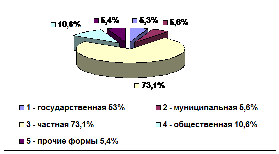 Наибольший удельный вес (73,1%) среди зарегистрированных предприятий составляют предприятия с частной формой собственности.