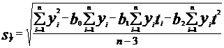 Величина среднего квадратического отклонения фактических уровней динамического ряда от выравненных для уравнения параболы второго порядка определится по формуле: