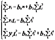 Система нормальных уравнений для нахождения параметров уравнения параболы (при соблюдении отсчета от условного начала) будет иметь вид: