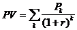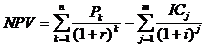 Допустим, делается прогноз, что инвестиция (IC) будет генерировать в течение n лет, годовые доходы в размере P1, P2, ., Рn. Общая накопленная величина дисконтированных доходов (PV) и чистый приведенный эффект (NPV) соответственно рассчитываются по формулам: