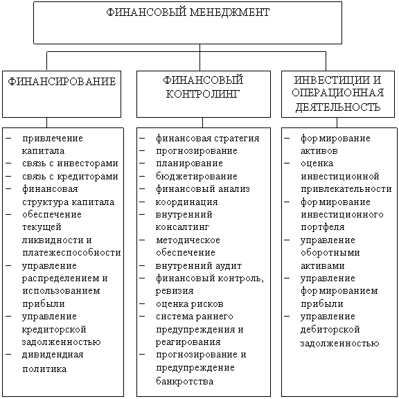 Согласно с функциями финансов предприятий (формирование финансовых ресурсов; распределение и использование; контроль за формированием и использованием финансовых ресурсов) можно выделить три основных функциональных блока финансового менеджмента: финансирование; вложение средств в инвестиционную и операционную деятельность; контролинг. Указанные функциональные блоки тесно связаны между собой и создают целостную систему функций финансового менеджмента. От эффективности выполнения этих функций зависит санационная способность и жизнеспособность предприятия.
