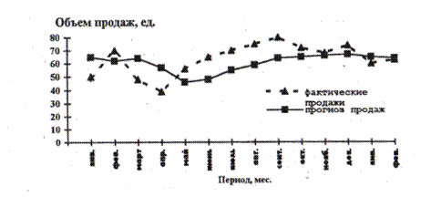 Как видно из графика, кривая прогнозов представляет собой сглаженную тенденцию по сравнению с кривой фактических продаж.