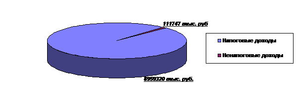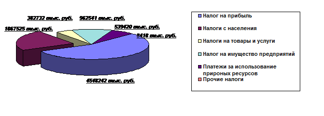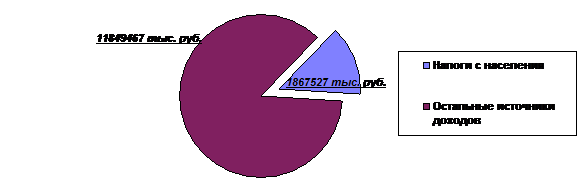 Налоги с населения, рассмотренные в данной курсовой работе, являются источником доходов практически для бюджетов всех уровней. Исключение с 2001 г. составляет Федеральный бюджет. До 1997 года в Федеральный бюджет перечислялось 10 процентов от суммы подоходного налога с 01 января 2001 г. 1 процент. В настоящее время налоги с населения, рассмотренные в данной курсовой работе, перечисляются в основном в региональные бюджеты. Для выявления их роли в формировании доходной части я рассмотрим цифровые данные о бюджете субъекта Федерации Самарской области на 2001 год. Налоговые доходы Самарской области (данные в тыс. руб.): 8959320, среди них подоходный налог – 1867527. Таким образом, сумма налогов с населения, перечисляемых в региональный бюджет 1867527 тыс. руб., причем всю эту сумму составляет подоходный налог. Если считать в процентах к налоговым доходам Самарской области, то подоходный налог составляет 23 процента. Таким образом, видно, что в налоговых доходах бюджета Самарской области одно из важнейших мест занимают налоги с населения, в частности «Налог на доходы физических лиц» - 20,8 % (для сравнения наибольший налоговый доход причитается на налог на прибыль – 50,8 процентов). Для наглядности представим данные в диаграммах: