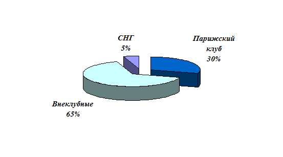 В процессе распада бывшего СССР кредитные линии, предоставленные правительствами развитых стран «под перестройку», продолжали действовать (в отличие от займов коммерческих банков), продукция поступала всем бывшим союзным республикам, в то время как обслуживание накопленного долга осуществлялась только за счет средств Российской Федерации. В рамках базового соглашения (1996 г.) по долгосрочной реструктуризации официальной задолженности России заключены двусторонние межправительственные соглашения с 18-ю странами-членами Парижского клуба: Австралией, Австрией, Бельгией, Великобританией, Германией, Данией, Испанией, Италией, Канадой, Нидерландами, Норвегией, Португалией, США, Швейцарией, Швецией, Францией, Финляндией и Японией. Кроме того, подписано свыше 60 межбанковских соглашений о порядке учета и погашения задолженности и почти столько же коммерческих контрактов по выверке сумм задолженностей. Отсроченный долг подлежит погашению с 2002 по 2020 гг. нарастающим, а затем убывающим графиком платежей. Агентом по соответствующим операциям определен Внешэкономбанк. Структура внешних финансовых активов России выглядит следующим образом: