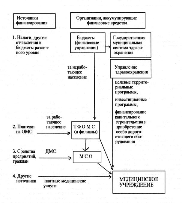Для объективной оценки современного состояния финансирования здравоохранения России собраны данные за 1992-94 гг., которые характеризуют бюджетные, внебюджетные и прочие источники [31]. Схема финансирования лечебного учреждения в современных условиях претерпевает значительные изменения по сравнению с существовавшей ранее. Финансирование медицинских учреждений в условиях медицинского страхования осуществляется по схеме, представленной на рис. 7.