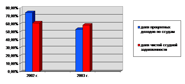 Следует обратить внимание на то, что темп снижения доли ссудной задолженности в активах значительно ниже темпа снижения доли процентных доходов по ссудам в совокупном объеме процентных доходов, что может свидетельствовать о снижении доходности ссудных операций банка. Графически это представлено на рис.2.