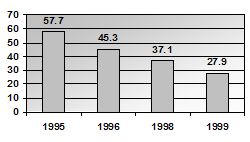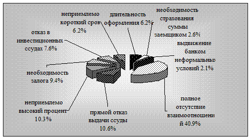 На диаграммах 1 и 2 продемонстрирована динамика числа малых предприятий России, воспользовавшихся ссудами банков, а также распределение факторов, определяющих отказ субъектов малого предпринимательства от получения кредитов. Диаграммы составлены на основе данных, полученных в результате опроса руководителей малых предприятий Российским независимым институтом социальных и национальных проблем. Эти графики иллюстрируют уже описанную ситуацию. С начала 90-х годов активность сотрудничества российских малых предприятий с отечественными и зарубежными кредитными институтами неуклонно падала. При этом в 1999 г. лишь 14,1 % малых предприятий смогло получить ссуды для финансирования капиталовложений, остальные 13,8 % использовали кредиты в целях восполнения недостатка собственных оборотных средств. В диаграмме 2 особенно обращает на себя внимание тот факт, что полное отсутствие «взаимоотношений» малого бизнеса с банками вряд ли возможно. Какой-то минимум сотрудничества банков и организаций существует всегда, хотя бы на уровне обслуживания расчетных счетов. Следовательно, этот фактор следует понимать скорее как невозможность получения от партнерского банка не только кредитных, но и любых других услуг.