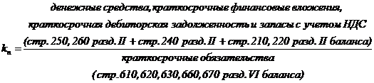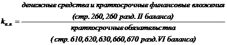 Мгновенную платежеспособность предприятия характеризует коэффициент абсолютной ликвидности, показывающий, какую часть краткосрочной задолженности может покрыть организация за счет имеющихся денежных средств и краткосрочных финансовых вложений, быстро реализуемых в случае надобности. Краткосрочные обязательства включают: краткосрочные кредиты банков и прочие краткосрочные займы, краткосрочную кредиторскую задолженность, включая задолженность по дивидендам, резервы предстоящих расходов и платежей, прочие краткосрочные пассивы. Показатель рассчитывается по формуле