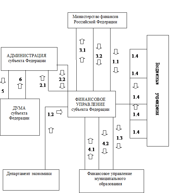 Департамент по финансам, бюджету и контролю администрации области, руководствуясь указаниями Министерства финансов Российской Федерации, расчетными показателями ГЭУ администрации области, доводит до сведения муниципальных образований (1.3) и принимает от областных распорядителей кредитов бюджетных учреждений заявки на финансирование в следующем году (1.4).