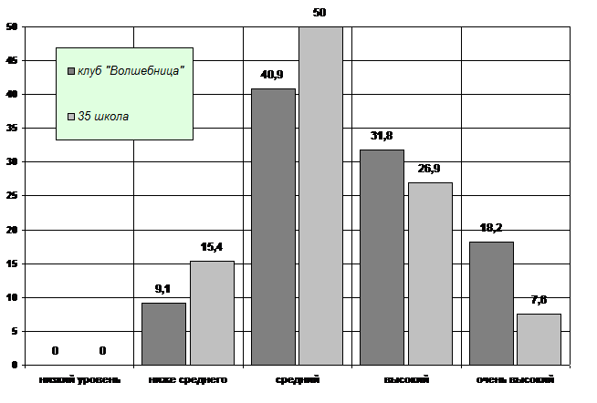 Низкий уровень коммуникативных и организаторских способностей в клубе «Волшебница» и в школе 35 соответствует 0%. Это скорее всего объясняется тем, что именно в старшем подростковом возрасте девочкам ярко выраженное стремление к общению. При этом потребность в этом проявляется раньше и сильнее, чем у мальчиков.