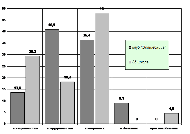 Хочу обратить внимание на то, что соперничество, как способ поведения в конфликтной ситуации в клубе «Волшебница» выбрали всего 13.6% девочек, а в школе №35 – 29.3%, что превышает в два раза результат моих подопечных.