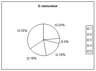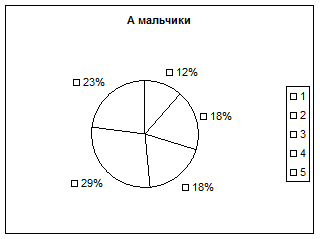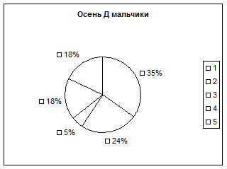 Несколько лучше были результаты осенью у мальчиков, так высокая и выше средней оценка индекса Шаповаловой наблюдались у 5% и 18% соответственно у мальчиков, занимавшихся спортом (плаванием и легкой атлетикой), на 6% до 24% увеличилось количество учащихся с оценкой ИШ ниже среднего и не изменился процент школьников (18%) с низким значением индекса Шаповаловой.