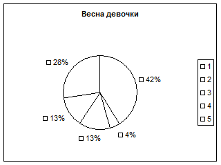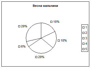 Среднее значение ИР весной в 4 «А» классе были у 40% и 29% мальчиков, что свидетельствовало об оптимальном уровне адаптационных резервов их кардиореспираторной системы. Низкая и ниже средней оценка индекса Руфье была весной у 7% и соответственно у 27% девочек, а у мальчиков у 6% и соответственно 29%.