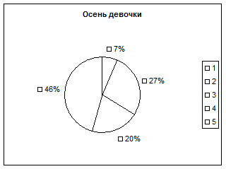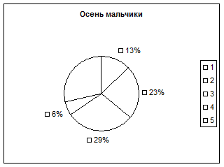 Как следует из данных, представленных на рисунке № 10 «Б», осенью нет ни одной девочки с высокой оценкой ИР, а у 20% учениц оценка ИР была выше средней, это на 7% больше, чем весной. Количество девочек со средней оценкой индекса Руфье увеличилось осенью на 6% и составило 46%, это означает, что у двух девочек Нины П. и Кати П. адаптационные резервы кардиореспираторной системы осенью несколько снизились. Количество учениц с низкой и ниже средней оценкой индекса Руфье осенью не изменилось 7% и 27% соответственно. Как следует из данных, приведенных на рисунке № 10 «Д», количество мальчиков с низкой 6%, ниже среднего 29% и средней 29% оценками индекса Руфье осенью не изменилось, но несколько снизились адаптационные резервы кардиореспираторной системы у Кирилла П., т.к. его высокая оценка ИР весной стала выше средней осенью, но в целом у мальчиков функциональное состояние и резервные возможности сердечно – сосудистой и дыхательной систем лучше, чем у обследованных девочек, что очевидно связано с их больней двигательной активностью. Достоверно установлено, что количество занятий физическими упражнениями для адекватного развития организма школьников, предусмотренное существующим ныне учебным планом, недостаточно, т.к. школьные уроки физической культуры (2 часа в неделю) восполняют двигательный дефицит только на 11% (Солодков А.С., Сологуб Е.Б., 2001г.).