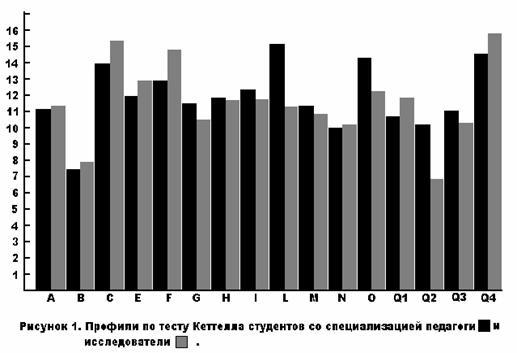 В целом выявленный нами профиль по тесту Кеттелла не соответствует известным типовыми профилями учителей средней школы [42, 53]. Учителя, в отличие от других специалистов, работающих с детьми (психологов, медиков, организаторов образования), характеризуются выраженной конкретностью мышления (среднее значение по фактору В), нормативностью поведения и суждений (значения по фактору G выше среднего) и скорее практичностью, чем склонностью к применению своего воображения (фактор М) [42]. Сопоставление этих факторов с тем, что мы наблюдали у студентов со специализацией педагог, позволяет заключить, что качества, составляющие основу предрасположенности к учительскому труду у студентов, со специализацией педагог не сформированы.