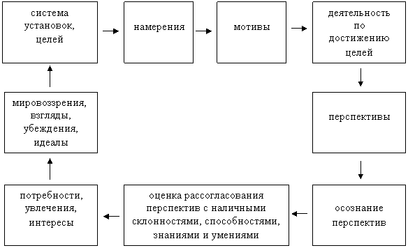 Как показано на этой модели, потребности, увлечения и интересы студента возникают на основе осознания перспектив и адекватной оценки степени рассогласования требований перспектив с наличными склонностями, знаниями и умениями. На основе общезначимых перспектив формируются мировоззрения, взгляды, убеждения и идеалы, система целей и установок, намерения. Перспективы выступают в данном случае в качестве отдельной цели студента.