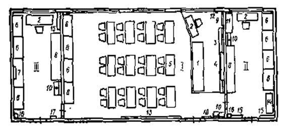 Рис. 10. Примерная планировка объединенного кабинета физики сельской восьмилетней школы (первый вариант): 1—демонстрационный стол; 2— стол учителя; 3—классная доска; 4—экран; 5—стол ученический; 62 шкаф для размещения учебного оборудования; 7—шкаф с вытяжным устройством; 8—рабочий стол; 9—счеты; 10—бак для воды; II—стол с набором инструментов; 12—устройство для управления затемнением; 13— стенд: 14—тележка-подставка для кинопроектора; 15—ящик для таблиц; 16—огнетушитель; /7—аптечка;