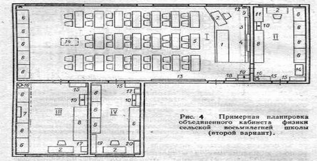 Средние школы в больших населенных пунктах, центральных усадьбах колхозов и совхозов обычно имеют параллельные классы с достаточной наполняемостью учащимися. Кабинеты физики таких школ по своему оборудованию не должны отличаться от кабинетов физики городских школ. Однако некоторые сельские школы в связи с небольшой наполняемостью классов учащимися (до 20 человек) и малой недельной нагрузкой по физике (16 ч в неделю) имеют в планировке и оборудовании кабинета физики специфические особенности.