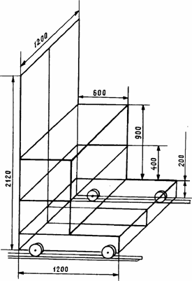 Основу конструкции составляет платформа размером 1200Х X 1200х200 мм, оборудованная четырьмя колесами с проточками в виде желоба. Одна пара колес с одной стороны платформы ограничена в своем перемещении вдоль оси. Противоположная пара колес может в небольших пределах перемещаться по оси.