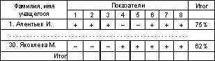 Показатели, по которым будет вестись проверка обученности, все данные о работе учащихся сводятся в таблицу (см. таблицу 2).