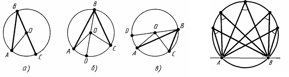 Общий случай сводится к рассмотренному частному случаю проведением вспомогательного диаметра BD (рис. 51, б, в). В случае, представленном на рисунке 51, б,