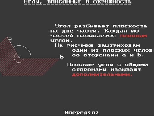 При запуске программы ученик видит на экране следующую картинку. Вверху экрана в центре написана тема “урока” “УГЛЫ ВПИСАННЫЕ В ОКРУЖНОСТЬ ” (она будет присутствовать на каждой странице). На этой странице вводится понятие плоского угла и определение дополнительных углов.