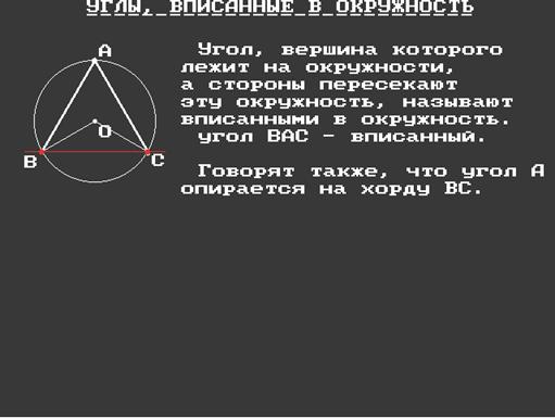 Появляется фраза “Говорят также, что угол А опирается на хорду ВС.”(рис. 59). На рисунке хорда ВС мигает красным цветом.