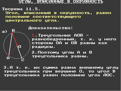 На странице 5 приводится теорема о равенстве угла вписанного в окружность половине соответствующего центрального угла и ее доказательство. Мигает первый шаг доказательства теоремы и стороны АО и ОВ. После они отметятся одинарными штрихами. Первый шаг – один из частных случаев.