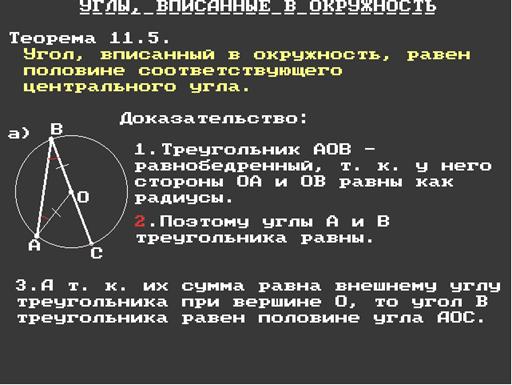 Теорема. Угол, вписанный в окружность, равен половине соответствующего центрального угла.