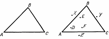 Точки D, Е и F (рис. 7) принадлежат внутренней области треугольника, точки X, У и Z — внешней области.