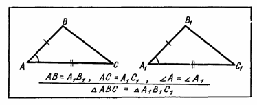 (Первый признак равенства треугольников). Если две стороны и угол между ними одного треугольника соответственно равны двум сторонам и углу между ними другого, то такие треугольники равны (рис. 9).