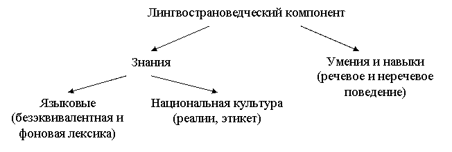 Лингвострановедческий компонент включает в себя определенные знания (языковые и культурологические), а также навыки и умения (речевого и неречевого поведения). Лингвострановедческий материал включает безэквивалентную лексику, обозначающую национальные реалии, фоновую лексику, коннотативную лексику.