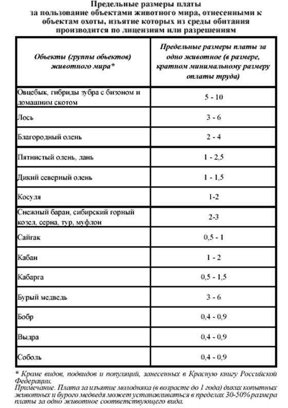 Плата за пользование указанными объектами животного мира, изъятие которых из среды обитания производится по лицензиям или разрешениям, устанавливаются органами исполнительной власти субъектов РФ с учётом местных особенностей и видов пользования объектами животного мира на основании предельных размеров платы, утверждаемых Правительством РФ.