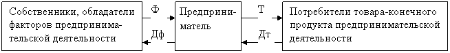Чтобы реализовать товар, надо его иметь. Поэтому предприниматель приобретает, получает или сам производит товар и осуществляет его продвижение для продажи потребителю, покупателю. Процесс получения предпринимателем продукта, необходимого потребителю, требует для осуществления наличия ряда факторов предпринимательской деятельности. Это все то, что использует предприниматель в своей деятельности, то есть средства производства и обращения товаров в виде рабочей силы, материальных, информационных, финансовых ресурсов, используемых для производства, транспортирования, продажи товаров. Частично предприниматель может сам обладать такими факторами. Если же он ими не обладает, то приобретает факторы Ф у их обладателей, собственников за денежную сумму Дф и с их помощью производит , получает, достает и продает потребителю товар Т.