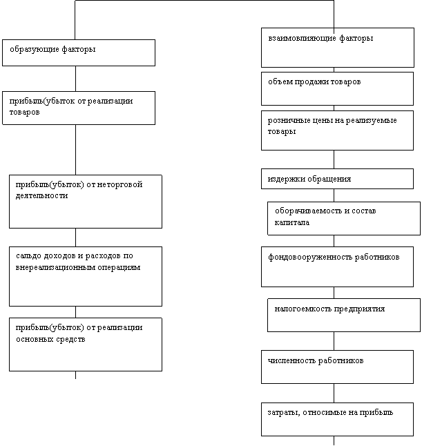Прибыль является синтетическим показателем, ее исследования должны носит» системный характер. Это означает, что совокупность факторов, влияющих на прибыль, представляет собой систему, состоящую из нескольких элементов. К подсистеме образующих факторов, от которых зависит формирование валовой прибыли, относятся валовой доход от торговой деятельности, прибыль (убыток) от реализации основных фондов и иного имущества, сальдо доходов и расходов по внереализационным операциям. Другую подсистему образуют взаимовлияющие факторы (рис. 2).