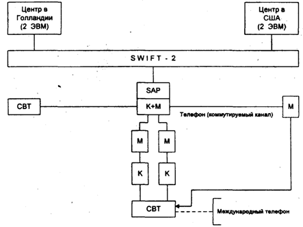 Для ввода в SWIFT-2 используется (рис. 5.9) Computer Bank Terminal (CBT), который снабжен линиями международной телефонной связи, криптографическим оборудованием (К) ENCRIPTOR (STEN) и модемом (М) (рекомендуется MOTOROLLA-CODEX). По линиям телефонной связи информация поступает на точку доступа в SWIFT - SWIFT Access Point (SAP) или в региональную администрацию - Regional ADministration (RAD). SAP представляет собой автономный заэкрани-рованный машинный зал, оборудованный в соответствии с требованиями SWIFT. Он снабжен таким же криптографическим оборудованием и модемным оборудованием, как и у пользователя. Таким образом, SWIFT начинает нести ответственность только с момента поступления информации с модема, установленного в SAP (RAD) на оборудование, юридически принадлежащее SWIFT.