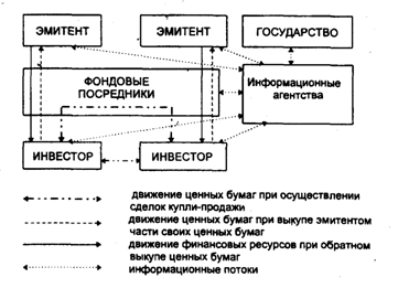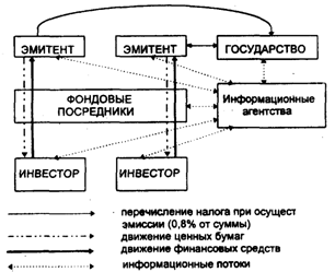 Рис. 14. Схема движения ценных бумаг, финансовых ресурсов и информации на первичном рынке (в схеме не приводится движение финансовых ресурсов, образованных от перечисления налогов юридическими и физическими лицами)