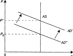 Инфляцию спроса при полной занятости и полной загруженности мощностей изображает следующий график (рисунок 3), где АD° и А'О'— кривые спроса, АS — кривая предложения, а рост цены (Р' - Рo) происходит при том же уровне выпуска (Q1).